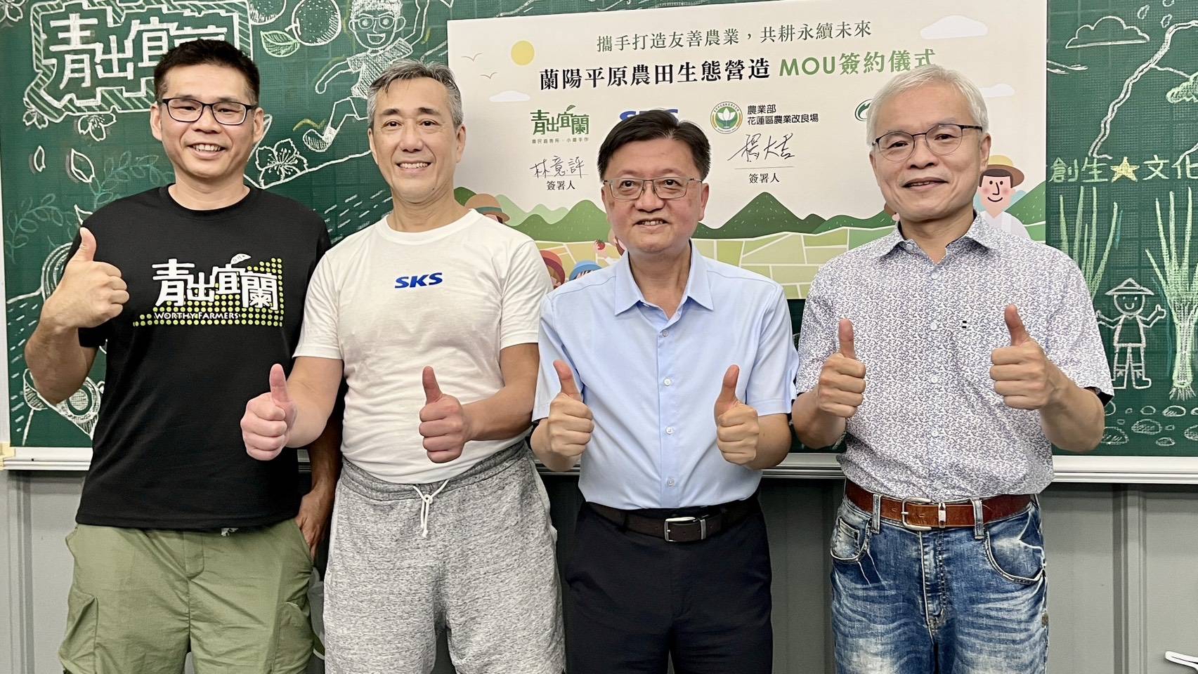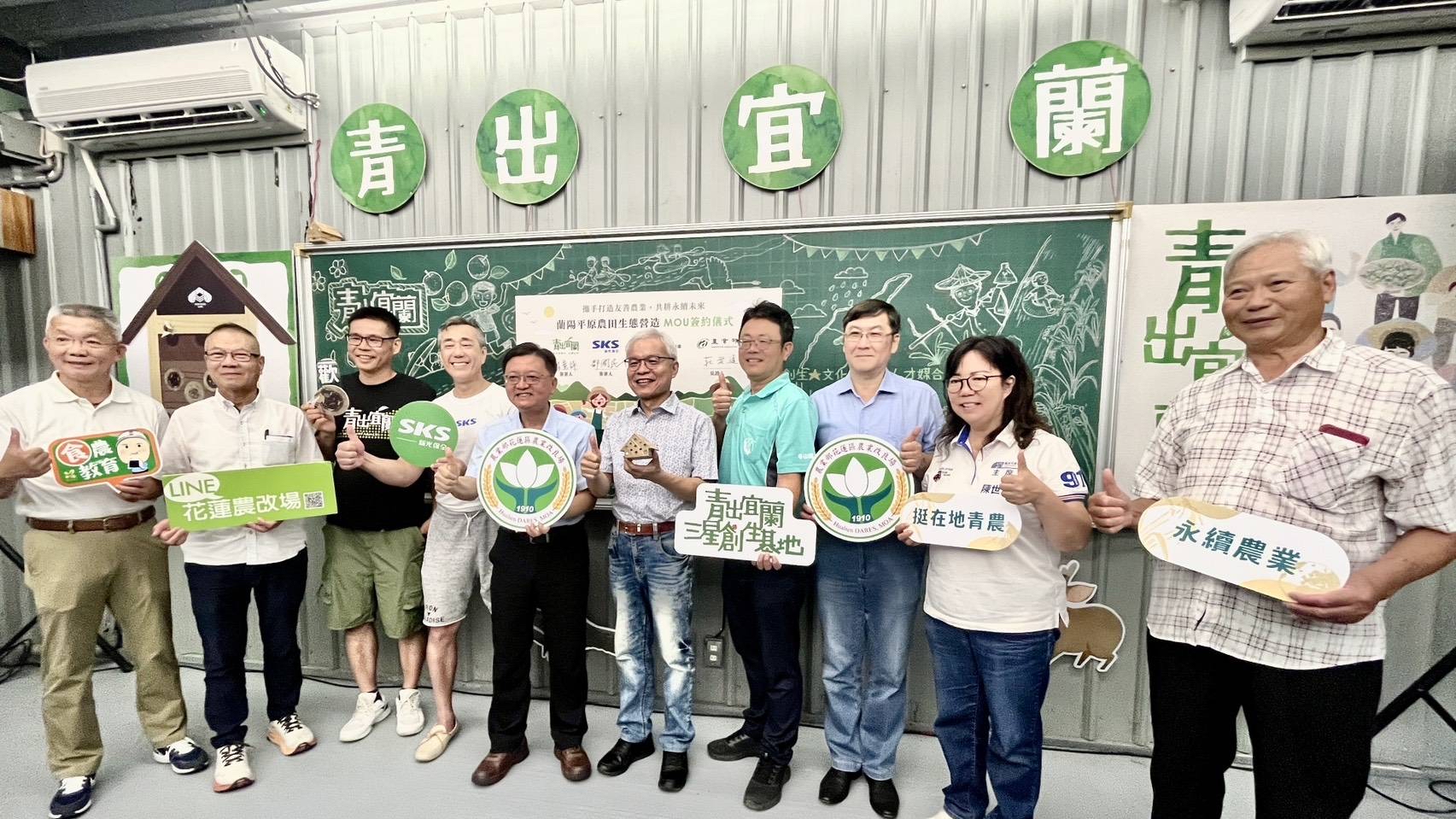 「蘭陽平原農田生態營造合作備忘錄(MOU)」簽約儀式,由花蓮區農業改良場 楊大吉場長、新光保全鄒國民資深協理、青出宜蘭農業運銷合作社 林意評理事長共同簽署,並由農業部資源永續利用司 莊老達司長見證